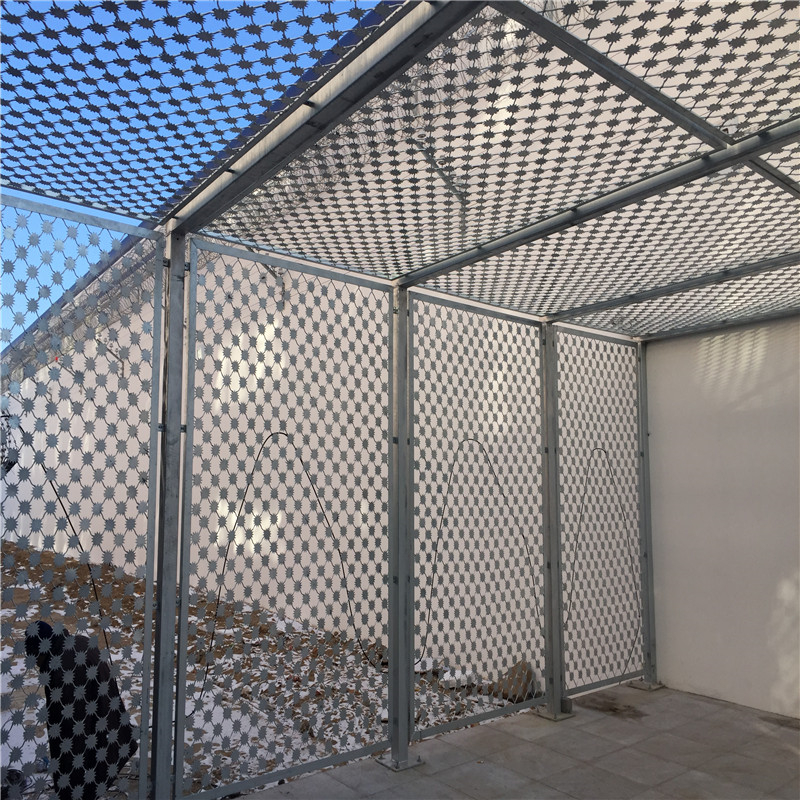 (7)刀刺網(wǎng),抗拉強(qiáng)度〉550N/㎜,刀型整齊,刀片鋒利,排列均勻、致密,連接牢固,防腐能力強(qiáng),可達(dá)到防翻躍、防拆卸高安全防護(hù)等級(jí)。