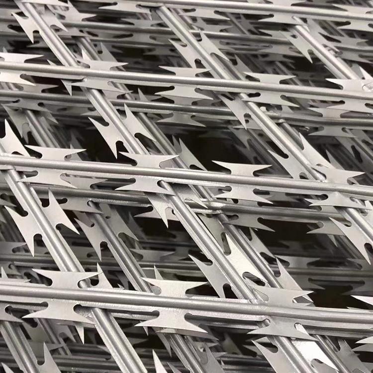 刀片隔離網(wǎng)主要用于園林公寓.機關(guān)單位.監(jiān)獄.哨所.邊防等的圈禁防護。刀片隔離網(wǎng)由銳利尖角鍍鋅鋼板或不銹鋼薄板做刀片,高張力鋼絲做芯線組合而成的阻絕器材。由于刀片刺繩防護網(wǎng)造形獨特不易觸摸,因而能達到極好的防護隔離效果。直線形刀片刺網(wǎng)由刀片型直線刺網(wǎng)交叉焊接成型,可用于防盜窗、高速護欄、隔離柵。施工迅速、效果顯著。刀片隔離網(wǎng),有多種架設(shè)方式可供選擇,施工迅速,既省經(jīng)費,又可達到安全防護網(wǎng)效果。