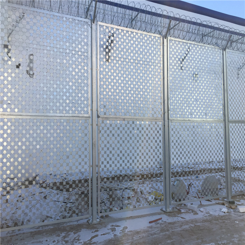 工程案例監(jiān)獄護欄網(wǎng)是一款為高機密高安全場所設計新型護欄網(wǎng),它主要是采用先進高強度的刀片刺網(wǎng)與優(yōu)質護欄網(wǎng)的結合體,由V型支架立拄,加強型焊接片網(wǎng),安全防盜連接件和刀片刺網(wǎng)組成,既安全環(huán)保又經(jīng)久耐用。刀片刺網(wǎng)是一種新型防護網(wǎng),由銳利尖角鍍鋅鋼板或不銹鋼薄板做刀片,鋼絲做芯線組合而成的防護器材.監(jiān)獄護欄網(wǎng)刀片刺網(wǎng)具有嚇阻、防翻越等效果,材質堅硬,高強度,高張力,造型設計獨特,不宜觸摸,因而能達到極好的防護隔離效果,監(jiān)獄護欄網(wǎng)采用低碳鋼絲焊接而成的網(wǎng)片、立柱、刺鐵絲(可選)、斜撐(可選)連接而成。監(jiān)獄護欄網(wǎng)具有美觀、大方、防腐性好、易保養(yǎng)、防攀爬能力強。主要適用于監(jiān)獄,機場,軍工企業(yè)周圍的隔離防護,美化及防翻越工程。