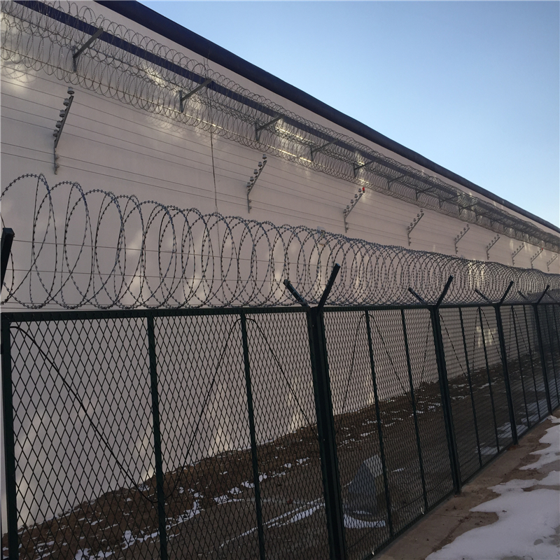 監(jiān)獄、看守所巡邏道隔離網(wǎng)上部安裝刀片刺網(wǎng)(刺絲滾籠),刀片刺網(wǎng)具有嚇阻、防翻越等效果,材質(zhì)堅(jiān)硬,高強(qiáng)度,高張力,造型設(shè)計(jì)獨(dú)特,不宜觸摸,因而能達(dá)到極好的防護(hù)隔離效果。巡邏道隔離網(wǎng)還具有施工簡便,經(jīng)濟(jì)實(shí)用等優(yōu)點(diǎn)。