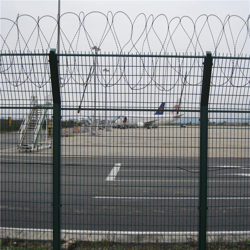 機場圍界是由Y型立柱、加強型焊接網片、安全防盜連接件和熱鍍鋅刀刺滾籠組成安全防御性級別很高的隔離網產品。機場圍界表面采用電鍍、熱鍍、噴塑或浸塑等防腐形式,具有良好的抗腐蝕、抗曬、抗老化的優(yōu)點。其造型美觀,既安全作用又有美觀作用。被廣泛應用在機場、監(jiān)獄、軍事基地等高安全場所。