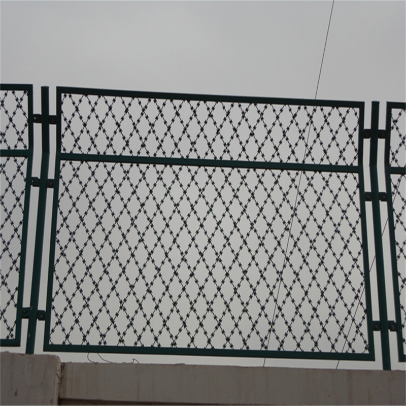 工程案例監(jiān)獄隔離網(wǎng)又稱監(jiān)獄護(hù)欄網(wǎng)或監(jiān)獄防護(hù)網(wǎng),主要是采用高強(qiáng)度的刀片刺網(wǎng)與普通防護(hù)網(wǎng)的結(jié)合,由V型支架立拄,加強(qiáng)型焊接片網(wǎng),安全防盜連接件和刀片刺網(wǎng)組成.刀片刺網(wǎng)是一種新型防護(hù)網(wǎng),由銳利尖角鍍鋅鋼板或不銹鋼薄板做刀片,鋼絲做芯線組合而成的防護(hù)器材.