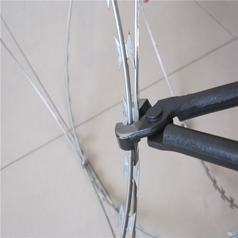 工程案例刀片刺繩護(hù)欄網(wǎng)是一種近年發(fā)展起來的防護(hù)、隔離能力較強(qiáng)的新型防護(hù)網(wǎng)產(chǎn)品。它采用鋼板沖壓成型包附于熱鍍鋅鋼絲(筋絲)之上,由銳利尖角鍍鋅鋼板或不銹鋼薄板做刀片,高張力鋼絲做芯線組合而成的。鋒利的刀型刺由雙線扣裝后成蛇腹?fàn)睿让烙^又讓人不寒而栗。起到了很好的阻嚇作用。