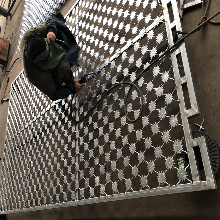 1、監(jiān)獄梅花刺片隔離網(wǎng)為單層梅花刺片網(wǎng),直徑不小于7.5cm,刺片厚1.5mm,采用Q235低碳鋼板沖壓成型。