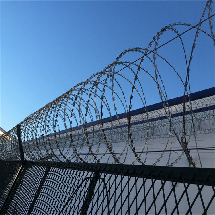 工程案例我們平時見到的隔離網(wǎng)頂部都會加裝蛇腹形刀刺網(wǎng),這個設計主要是在隔離網(wǎng)一層防攀爬效果的基礎上面,再多一道‘安全墻’,這種刀刺網(wǎng)都是利用鋼板沖出刀片來,用專制卡扣固定在一起。兩個圈用卡扣固定,這樣拉伸開才是連貫一圈一圈固定在一起。也可以拉直焊接成網(wǎng)片使用,尺寸:長度和寬度可以根據(jù)客戶需求進行制作,一般常見的長度為2-3米,寬度為1.5米-2.5米。可以根據(jù)不同的用途搭配立柱合邊框進行自由組合。網(wǎng)孔可設計菱形或者方形,材質(zhì)常見的有不銹鋼、熱鍍鋅等,不同的材質(zhì)可根據(jù)環(huán)境和使用條件選擇。焊接刀片護欄網(wǎng)作為一種高效的防護設施,其產(chǎn)品規(guī)格和結(jié)構(gòu)特點的不同組合可以滿足不同的使用需求,適用于工廠、學校、軍事基地、機場、大型活動場地等各種需要防護的場所,是一種重要的安全配置。