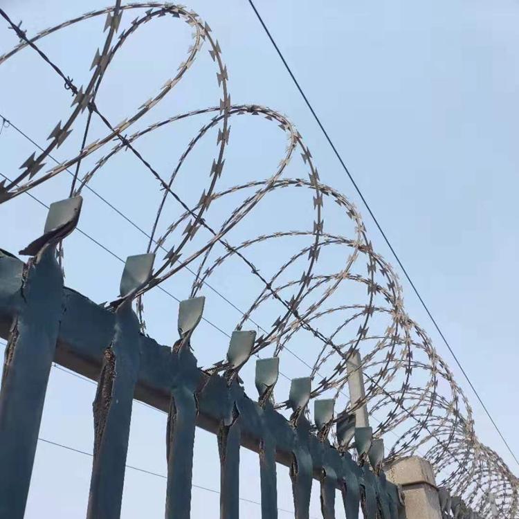 也就是簡略的一部了,把用鐵絲串接在一起的刀片刺網(wǎng),擺開固定就行了。有時候為了防護(hù)效果更強(qiáng),會在Y 型支柱的支架上各加上一條直線型的刀片刺繩。既漂亮又防護(hù)強(qiáng)!