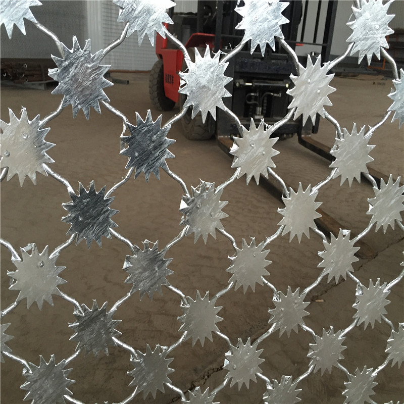 新聞動態(tài)1、梅花刺片護欄網(wǎng)又名太陽花刺片隔離網(wǎng),為太陽的后裔單層梅花刺片網(wǎng),直徑不小于7.5cm,刺片厚1.5mm,采用Q235低碳鋼板沖壓成型。