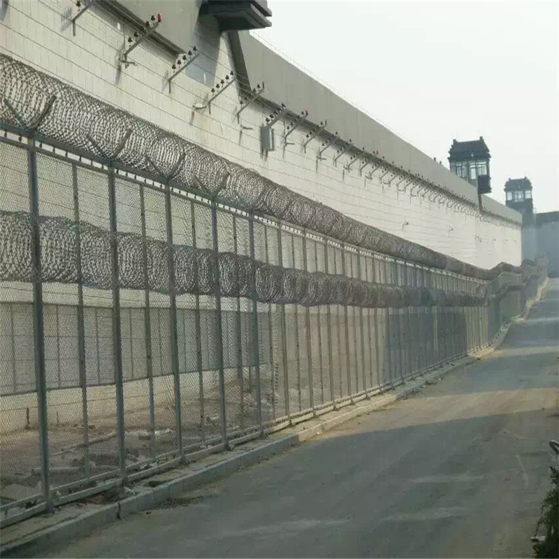 2. 監(jiān)獄隔離網表面工藝:防腐處理,耐老化,耐酸堿,不褪色;刀刺鐵絲網的布置密度不小于10圈/米,每相鄰一個圈的間距不大于100mm,監(jiān)獄隔離網的材料是304不銹鋼。
