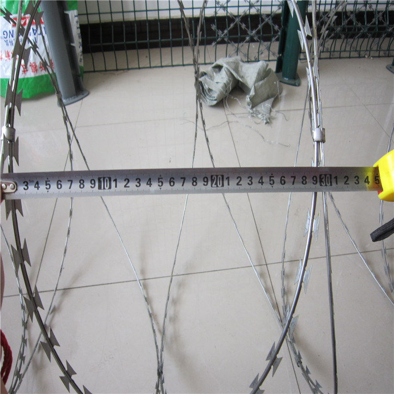 刀片刺繩又名刮刀型刺絲,是一種近年發(fā)展起來的防護、隔離能力較強的新型防護網(wǎng)產(chǎn)品。鋒利的刀型刺由雙線扣裝后成蛇腹?fàn)?,既美觀又讓人不寒而栗。起到了很好的阻嚇作用。同時該產(chǎn)品具有美觀、防阻效果好、施工便利等優(yōu)點。