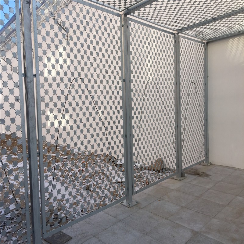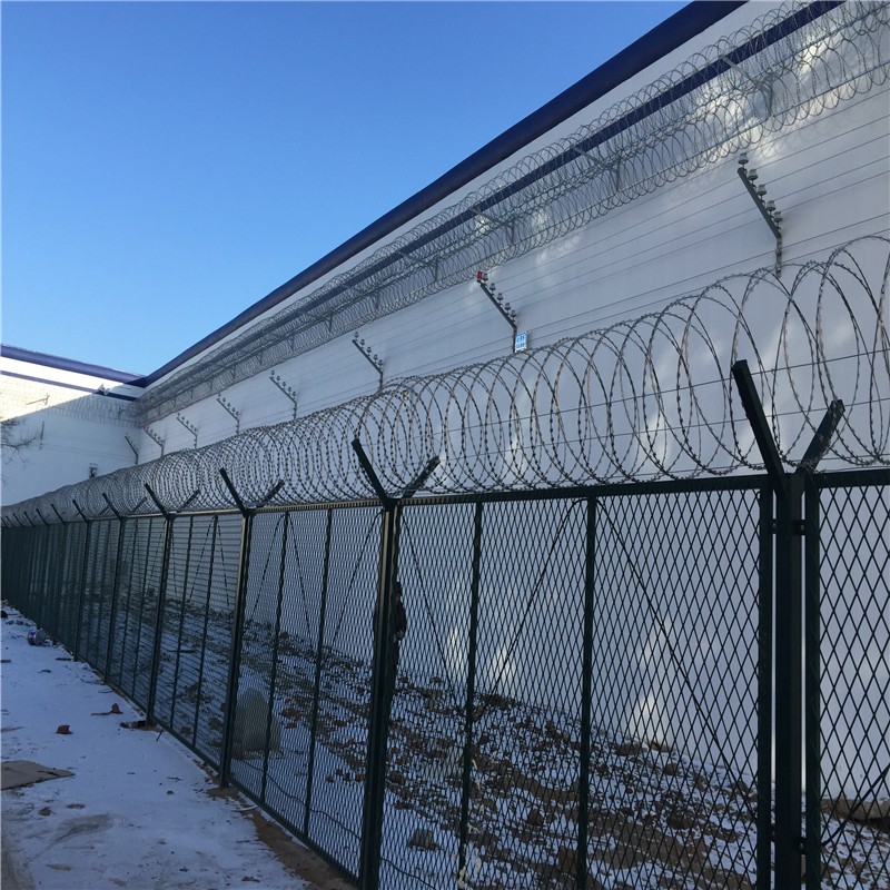 監(jiān)獄刀片刺網(wǎng)主要是由熱鍍鋅鋼板或不銹鋼薄板沖壓而成的,它擁有尖銳的刀片,高張力鍍鋅鋼絲或者不銹鋼絲做芯線組合而成的產(chǎn)品。由于刺網(wǎng)的形狀很特別,而且每個角度都有尖狀刀片,因而能達到極好的防御保護效果。產(chǎn)品具有結(jié)構(gòu)新穎、堅固緊密、網(wǎng)面平整、網(wǎng)孔均勻、刀鋒銳利、防攀爬、抗腐蝕性強等特點。建設(shè)于監(jiān)獄的內(nèi)外墻地面及高墻之上,形成一道高不可攀、難以逾越的隔離障礙。具有嚇阻、防翻越等效果,材質(zhì)堅硬,高強度,高張力,造型設(shè)計獨特,不宜觸摸,因而能達到極好的防護隔離效果.
