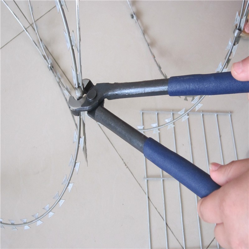 平板式刀片刺繩護欄網(wǎng)是刀片刺繩護欄網(wǎng)的一種新的應(yīng)用方式,它是將單圈式刀片刺繩平壓成板狀,或?qū)杉稳Υ汤K壓平后交叉相錯使用,外表美觀而且實用,可與直線式刀片刺網(wǎng)搭配使用,構(gòu)成下直線上平板的防護墻,或僅用平板式刺網(wǎng)構(gòu)成防護墻。