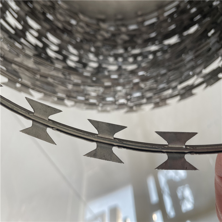 1、制作刀片:選用優(yōu)質Q195L熱鍍鋅帶鋼(或者不銹鋼帶鋼),根據(jù)客戶選定的花型,經(jīng)高速沖床,沖軋成鋒利的刀片刺條,把刀片刺條纏成圓餅狀。