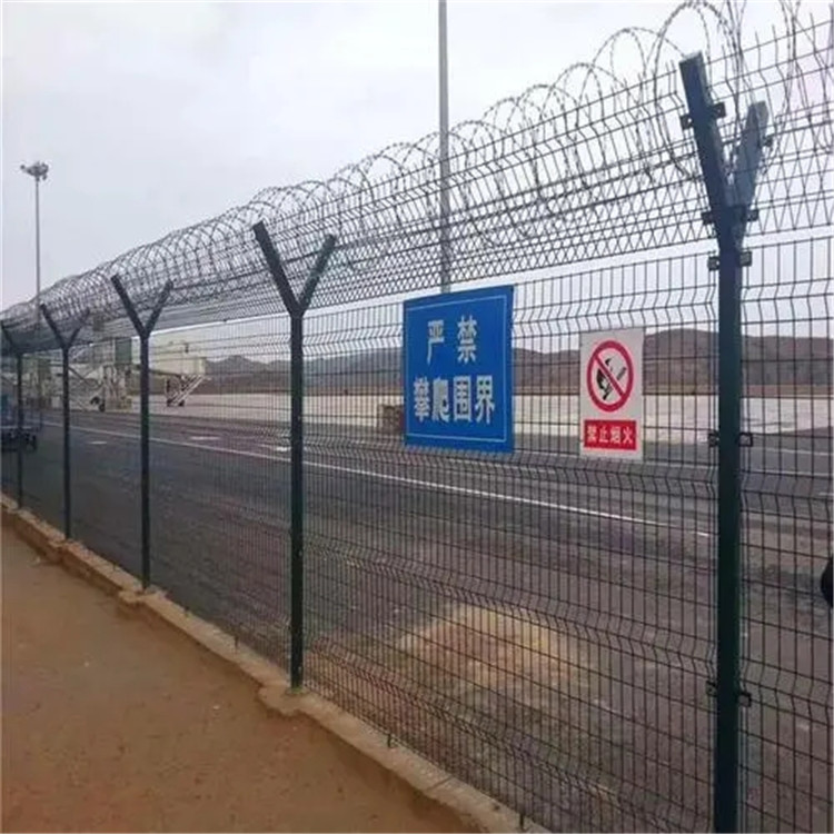 標準的機場圍界采用直徑5.0mm優(yōu)質(zhì)低碳鋼絲焊接,網(wǎng)孔50mm*100mm,50*200mm,也可根據(jù)要求定做。Y型安全防御護網(wǎng)所用的立柱為60X60的矩形鋼或圓管立柱,頂端焊有V型支架,也可采用70mmX100mm的掛式連接立柱。產(chǎn)品均為熱鍍鋅后采用高質(zhì)量的聚酯粉末靜電噴涂,采用國際流行的RAL顏色。連接方式主要使用M卡,抱卡連接,表面處理常用熱鍍、噴塑、浸塑,常見顏色為綠色。具有美觀、實用、方便運輸和安裝的特點,安裝時還能適應地形,與立柱連接位隨地面起伏可上下調(diào)整。
