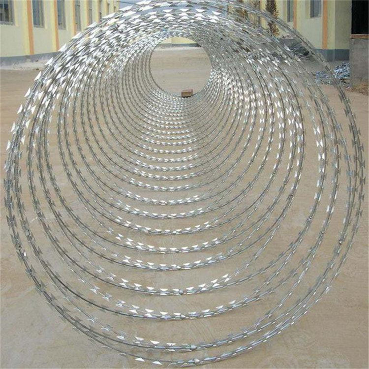 新聞動態(tài)刀片刺繩又叫蛇腹形(型)刀刺網(wǎng)或螺旋型交叉刀片刺網(wǎng),由沖切鋼板采用機(jī)械壓軋在鋼絲上成型,刀刺寬度22mm,兩刃垂直間距15mm,刀刺縱向間距34mm,芯絲直徑為2.5mm。刀片采用厚度0.5mm的Q195鋼板沖切制作,芯絲由HPB300?6.5mm高線鋼絲加工。可搭配支架在圍墻上使用,也可架設(shè)在隔離網(wǎng)上,鐵路、邊防使用率也很高。也可以拉直焊接成網(wǎng)片使用,長度和寬度可以根據(jù)客戶需求進(jìn)行制作,一般常見的長度為2-3米,寬度為1.5米-2.5米??梢愿鶕?jù)不同的用途搭配立柱合邊框進(jìn)行自由組合。網(wǎng)孔可設(shè)計菱形或者方形,材質(zhì)常見的有不銹鋼、熱鍍鋅等,不同的材質(zhì)可根據(jù)環(huán)境和使用條件選擇。焊接刀片隔離網(wǎng)作為一種高效的防護(hù)設(shè)施,其產(chǎn)品規(guī)格和結(jié)構(gòu)特點(diǎn)的不同組合可以滿足不同的使用需求,適用于工廠、學(xué)校、軍事基地、機(jī)場、大型活動場地等各種需要防護(hù)的場所,是一種重要的安全配置。