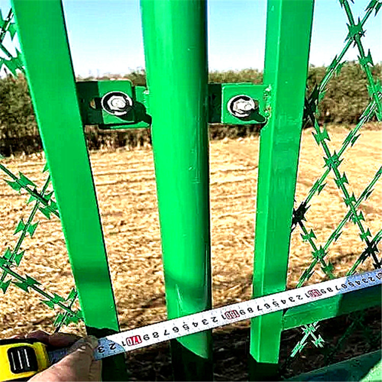 焊接型刀刺隔離網(wǎng)的制作工藝:把沖好的刀片裹在熱鍍鋅絲上面,經(jīng)調(diào)直達(dá)到預(yù)定的長度自動切斷,送入到模具內(nèi),排焊機(jī)把經(jīng)和緯相交叉的部分,沖過電流焊接到一起,數(shù)控電機(jī)拉動網(wǎng)片前進(jìn)一格,達(dá)到網(wǎng)片的長度后,排焊機(jī)自動停止工作,一張焊接好的刀片刺繩網(wǎng)片,就完成了,搭配Y型鋼立柱增加網(wǎng)片的穩(wěn)固性,表面處理的方式有兩種高亮銀粉磁漆處理和噴塑處理(也叫PVC處理)銀粉磁漆處理的優(yōu)點(diǎn)不影響刀片的鋒利,看起來刀片閃閃發(fā)亮,恐嚇性好,讓人望而生畏!適用于監(jiān)獄,軍事重地等。