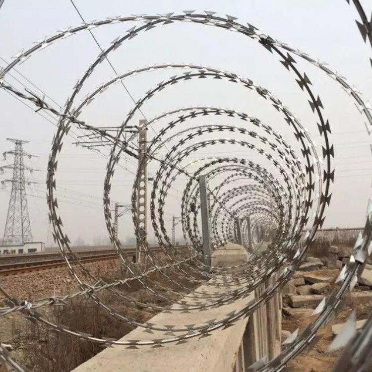 新聞動態(tài)刺絲滾籠采用刀片刺繩繞圈后相鄰兩圈每隔120度用刺絲連接卡固定,張開后形成蛇腹網(wǎng)狀,閉合后刀片刺繩圈徑為50cm,張開后每交叉圈安裝間距20cm,直徑不小于45cm。