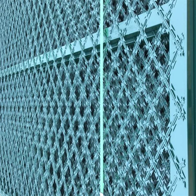菱形焊接刀片刺網(wǎng) 監(jiān)獄刀片刺網(wǎng) 刀片隔離網(wǎng)具有嚇阻、防翻越等效果,材質(zhì)堅(jiān)硬,高強(qiáng)度,高張力,造型設(shè)計(jì)獨(dú)特,不宜觸摸,因而能達(dá)到極好的防護(hù)隔離效果.在監(jiān)獄內(nèi)高層建筑物頂部設(shè)置阻隔網(wǎng)防止罪犯沖跳越獄。采用立式Y(jié)型柱鋼絲網(wǎng)加腹型刀刺網(wǎng),總高度1.8m,總體質(zhì)量要求:協(xié)調(diào)、美觀、堅(jiān)固、安全。