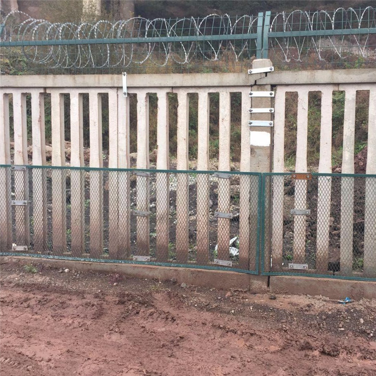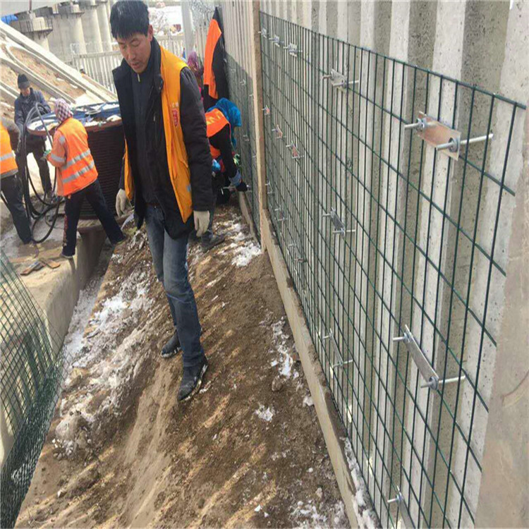 鐵路加密網(wǎng)格網(wǎng)長(zhǎng)度根據(jù)防護(hù)柵欄單元長(zhǎng)度確定,編織鋼采用熱鍍處理。直為2.2mm,鐵路加密網(wǎng)又叫格柵網(wǎng),四周采用扁鋼焊接加固,扁鋼為3mmX14m,格網(wǎng)應(yīng)進(jìn)行浸塑處理,格網(wǎng)設(shè)于柵欄內(nèi)側(cè)(靠近鐵路側(cè)),采用U型螺把加密網(wǎng)捆于欄欄片上,U型寬、長(zhǎng)應(yīng)根據(jù)欄片截面尺寸而定,一般總長(zhǎng)380mm,螺母于欄內(nèi)側(cè)。整個(gè)連接構(gòu)件表面做防腐處理。格柵網(wǎng)底部應(yīng)與下檻頂面密貼,兩端部應(yīng)與立柱側(cè)面密貼。